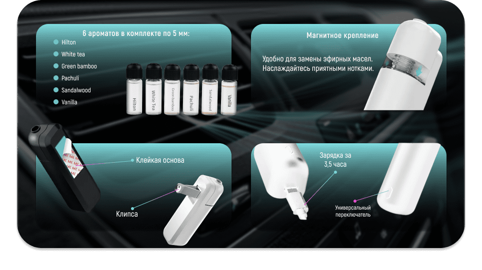 Аромадифузор легко встановлюється на повітропровід за допомогою кліпси або двобічного скотчу. Не містить токсичних матеріалів, можна використовувати в присутності дітей і хатніх тварин.